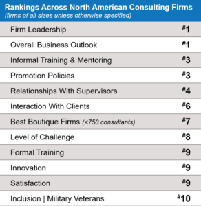 Impressively, SciVida climbed to the top spot among North American consulting firms of all sizes in the areas of firm leadership and overall business outlook, with #1 rankings in both. SciVida ranked highly in several additional areas, including informal training and mentoring (#3), promotion policies (#3), relationships with supervisors (#4), interaction with clients (#6), level of challenge (#8), formal training (#9), innovation (#9), and satisfaction (#9) among the hundreds of firms participating in the survey.